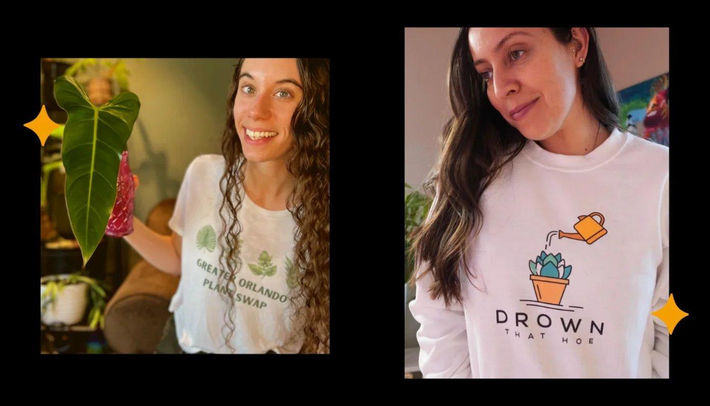 And we recommend using puns to your advantage if you want to up your merch game. We personally love this “Drown That Hoe” design from Plants With Krystal. These kind of designs are universal and will resonate with plant lovers everywhere.