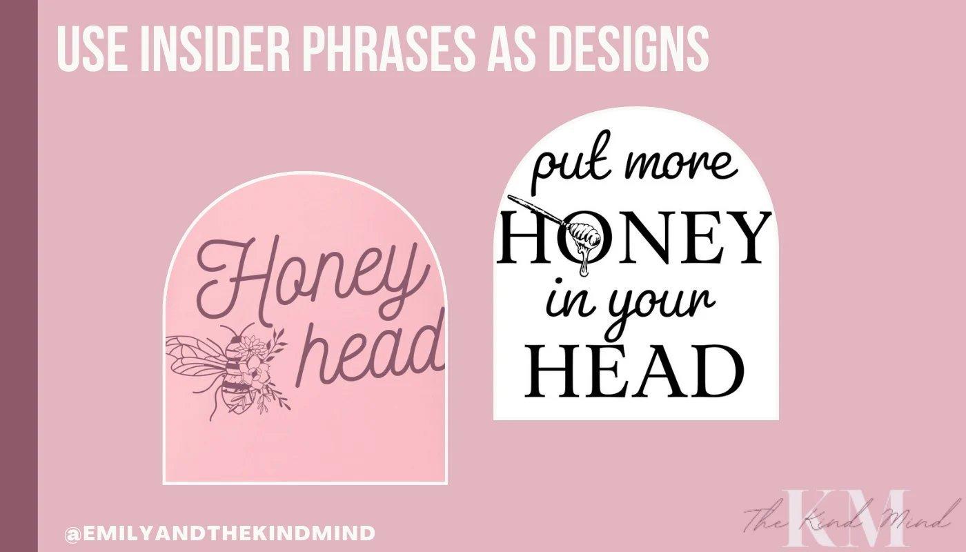 Maybe logos and symbols are too ordinary for your business. We love to see the creative ways shop owners interpret their brand, like Emily and the Kind Mind. The Kind Mind Project is a podcast Emily launched to help women achieve personal growth through a better mindset. One of the podcast’s mottos – To put more honey in my head, one drop at a time – has made it’s way into Emily’s merch line for her business.